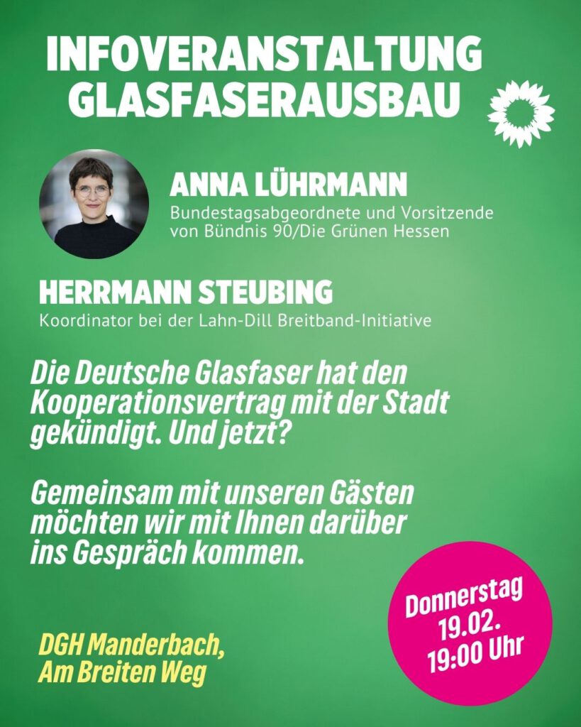 Wie geht es weiter? Gemeinsam mit Herrmann Steubing, Koordinator bei der Lahn-Dill Breitband-Initiative, und Anna Lührmann, Digitalpolitikerin im Bundestag, klären wir alle Fragen und sprechen darüber, was die Stadt jetzt tun kann.